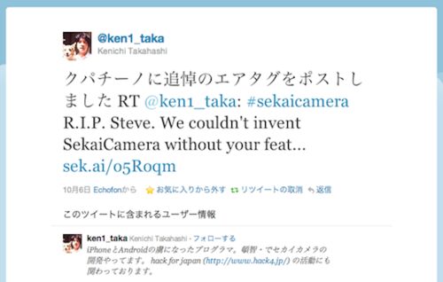 セカイカメラ開発陣の高橋さんがスティーブへの哀悼の辞をクパチーノのアップル本社に捧げてくれました。iPhoneの発明が無ければセカイカメラはこの世に存在していません。心から哀悼の意を表します。http://twitter.com/#!/ken1_taka/status/12185340710237…